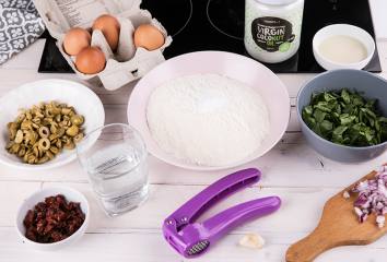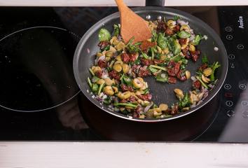 Pridáme cesnak a ďalej restujeme, následne pridáme baby špenát, stíšime oheň, pridáme sušené paradajky a olivy a dobre premiešame.